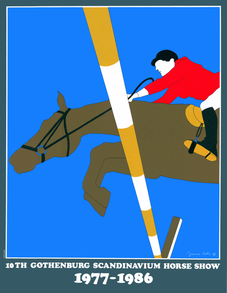 Poster for the 10th Gothenburg Scandinavium Horse Show (1977–1986), featuring a minimalist illustration of a rider in a red jacket jumping a horse over a pole, set against a pink background.